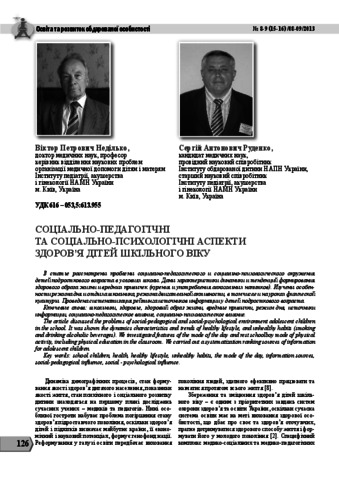 - Неділько, Віктор Петрович and Руденко, Сергій Антонович (orcid.org/0000-0002-1821-204X) (2013) Socio-pedagogical and socio-psychological aspects of the health of school-age children Education and Development of Gifted personality, 8-9 (15-16). pp. 126-129. ISSN 2309-3935
