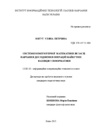 - Когут, У.П. (2015) Systems of computer mathematics as a teaching tool for future operations research experts in informatics Dissertation candidate thesis, Інститут інформаційних технологій і засобів навчання.