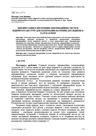 - Кільченко, А.В. (2015) The use of open access electronic information systems for pedagogical researches planning in education sphere Інформаційні технології і засоби навчання, 5 (49). pp. 176-186.
