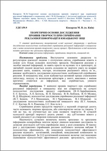 | Keywords: | рекламна інформація, сприймання, творчість, юнацький вік |