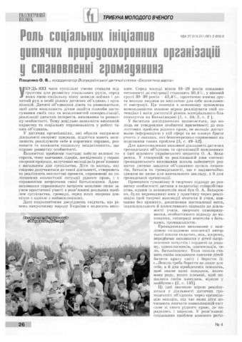 - Пащенко, Олена Вікторівна (2015) The role of the social initiatives of children's environmental organizations in growing of citizen Екологічний вісник, 4 (91). pp. 26-28.