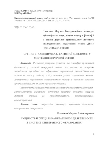 - Ілляхова, М.В. (2014) Gistand specificity of creative activity in continuing education Вісник післядипломної педагогічної освіти, 10 (23). pp. 37-46.