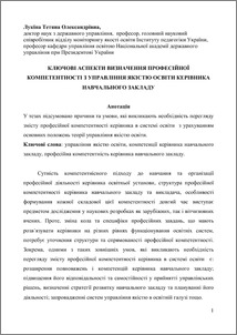 - Лукіна, Т.О. (2010) Key aspects of the definition of professional competence to the education quality management of the head of the institution In: Анотовані результати науково-дослідної роботи Інституту педагогіки АПН за 2009 р. (1). Педагогічна думка, м. Київ, Україна, pp. 221-223.