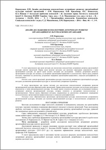 - Карамушка, Л.М. (orcid.org/0000-0003-0622-3419), Креденцер, О.В., Ковальчук, О.С. and Пенцак, К.А. (2014) Design of a study of psychological determinants of educational organizations’ culture development Актуальні проблеми психології : зб. наукових праць Інституту психології імені Г.С. Костюка НАПН України. – Т. І : Організаційна психологія. Економічна психологія. Соціальна психологія, 1 (40). pp. 3-9. ISSN 2072-4772