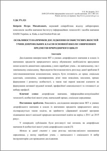 - Бісіркін, П.М. (2011) Features of research approaches of pupils’ personal qualities of basic school pre-profile training with studying of natural cycle subjects Інформаційні технології і засоби навчання, 6 (26). ISSN 2076-8184