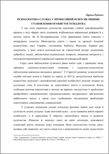 - Руденко, Л.А. (2012) Psychological Service in vocational education as a factor of adolescent personality Деякі питання допомоги та підтримки у вирішенні проблем людей різних віків. pp. 192-199.