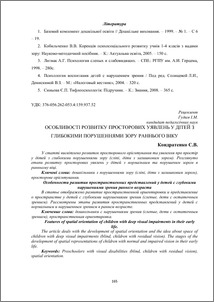 - Кондратенко, С.В. (orcid.org/0000-0002-0896-6227) (2013) Features of spatial orientation of children with deep visual impairments in their early life. Освіта осіб з особливими потребами: шляхи розбудови, 2 (4). pp. 165-179.