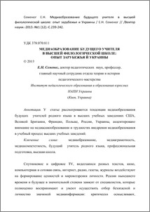- Семеног, Олена Миколаївна (2013) Medyaobrazovanyya the future teacher in the High society fylolohycheskoy School: Experience of Ukraine and zarubezhya Вектор науки, 1 (12). pp. 239-242.