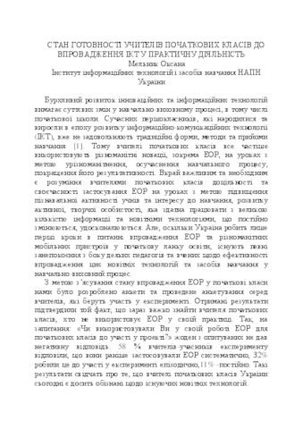The author reveals the main results of studying of the state of readiness of primary school teachers for the implementation of electronic educational resources (EER) in practice during the experimental work “Rozumnyky” (Smart kids), approved by the order of Ministry of Education and Science of Ukraine from 08.05.2014 number 564 (then – experiment). It was found out the problems of the mentioned above question, clarified how often the teachers use modern means of learning; the types of EER, they implement in practice; their opinion on quality of the electronic content they had used before the experiment; the most important quality criteria for EER of educational purposes for elementary school students; their attitude and willingness to implement innovations in the educational process.