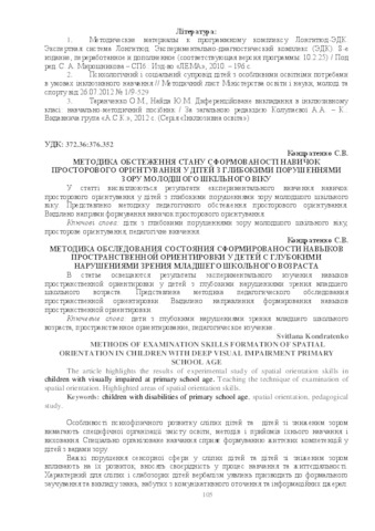 - Кондратенко, С.В. (orcid.org/0000-0002-0896-6227) (2015) Мethods of examination skills formation of spatial orientation in children with deep visual impairment primary school age Освіта осіб з особливими потребами: шляхи розбудови (10). pp. 105-111. ISSN 2313-4011