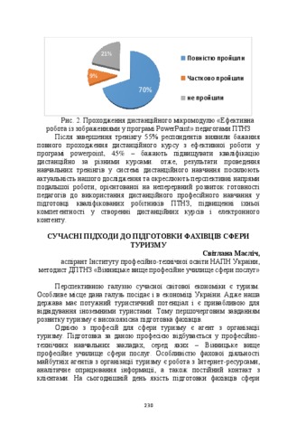 - Масліч, Світлана Володимирівна (orcid.org/0000-0002-8606-0949) (2017) Modern approaches to training specialists in the field of tourism In: Науково-методичне забезпечення професійної освіти і навчання: збірник матеріалів ХІ Всеукраїнської науково-практичної конференції (звітної), присвяченої 25-річчю НАПН України (м. Київ, 29 березня - 13 квітня 2017 р.) . Інститут професійно-технічної освіти НАПН України, м. Київ, Україна, pp. 230-231.