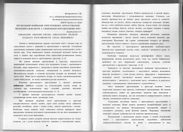 - Кондратенко, С.В. (orcid.org/0000-0002-0896-6227) (2017) Organizing training spatial orientation younger students with profound visual impairment In: Педагогіка та психологія: стратегії, технології, інновації: Збірник матеріалів всеукраїнської науково-практичної конференції, 15 червня 2017 р. . ТОВ "Задруга", м. Київ, Україна, pp. 54-58. ISBN 978-966-432-210-9