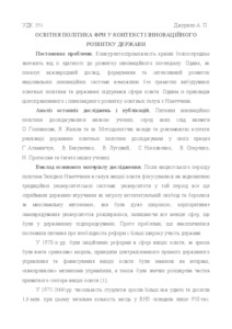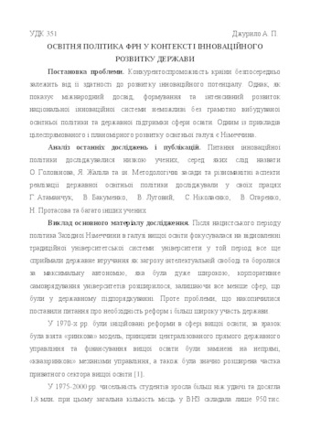 In the theses it is talking about German educational policy in the context of the innovative development of the state. The questions of reforming education in the FRG are disclosed. The government programs and funds related to innovations in education have been analyzed.
