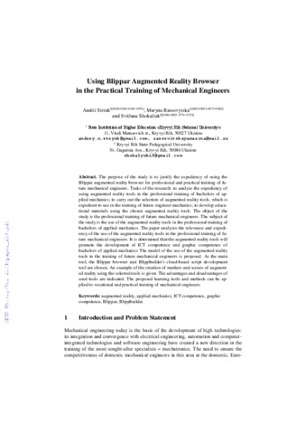 - Striuk, A.M., Rassovytska, M.V. and Shokalyuk, S.V. (orcid.org/0000-0003-3774-1729) (2018) Using Blippar Augmented Reality Browser in the Practical Training of Mechanical Engineers ICT in Education, Research and Industrial Applications. Integration, Harmonization and Knowledge Transfer 2018 : Proceedings of the 14th International Conference on ICT in Education, Research and Industrial Applications (2104). pp. 412-419. ISSN 1613-0073