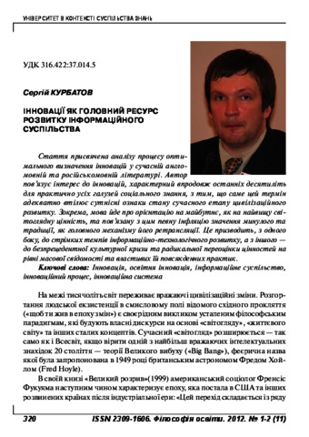 - Курбатов, Сергій (orcid.org/0000-0002-8929-7562) (2012) Innovation as a Main Tool of Development of Information Society Філософія освіти, 1-2 (11). pp. 320-329. ISSN 2309-1606 (In Press)