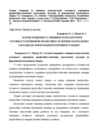- Бондарчук, О.І. and Пінчук, Н.І. (2015) Based trends and factors of psychological readiness of heads of vocational schools to creating a positive image Організаційна психологія. Економічна психологія: наук. журнал, 2. pp. 7-14.
