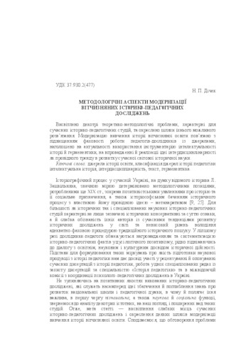 - Дічек, Наталія Петрівна (2014) Methodological aspects of modernization of national historical and educational research Педагогіка і психологія, 2 (83). pp. 67-75. ISSN 2304-0629