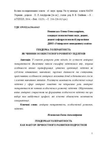 - Нежинська, О.О. (2014) Gender tolerance as a factor of teens' personal development Вісник післядипломної освіти: зб. наук. праць Ун-ту менедж. освіти НАПН України, 12 (25). pp. 218-226.