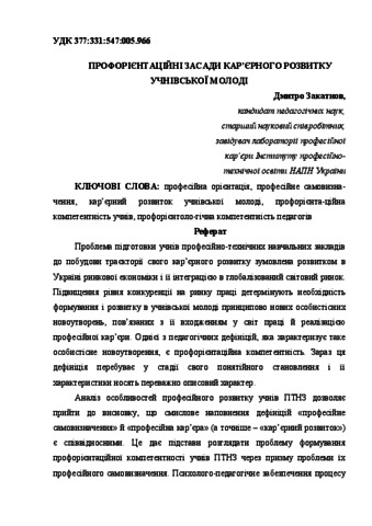 - Закатнов, Д.О. (2015) Professional orientation and proforientologic competences concerning vocational self-determination and career development of young students Науковий вісник ституту технічної освіти НАПН України. Професійна педагогіка: зб. наук. праць, 1 (9). pp. 86-94. ISSN 2223-5752