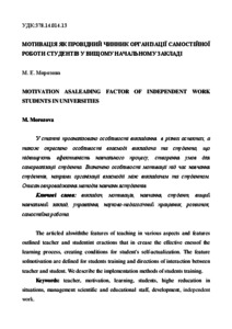 - Морозова, М.Е. (2015) Motivation asaleading factor of independent work students in universities Науковий журнал “ScienceRise”, 4/5 (9). pp. 22-26. ISSN 2313-6286