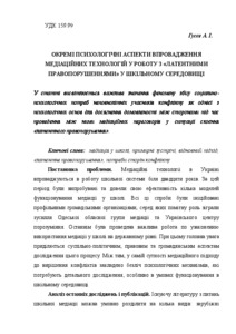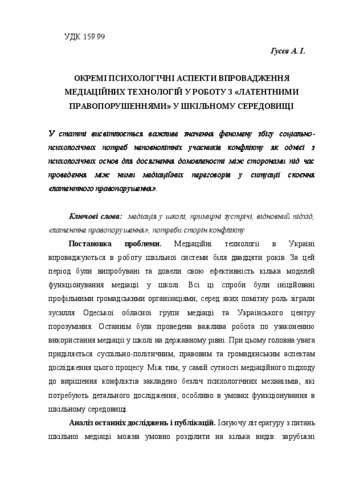 - Гусєв, А. І. (2015) Individual psychological aspects of the implementation of mediation techniques in working with "latent offenses" in the school environment. Теоретичні і прикладні проблеми психології, 1 (36). pp. 121-128. ISSN 2219-2654