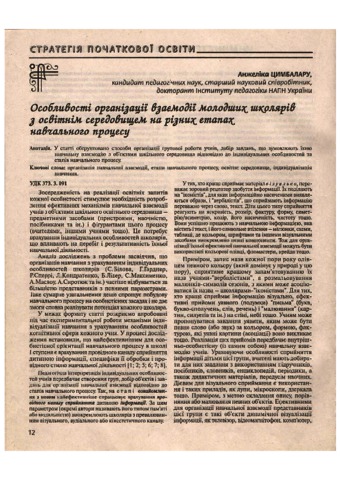 - Цимбалару, Анжеліка Дмитрівна (2013) Features of interaction of younger students with the educational environment at different stages of the educational process Початкова школа, 8 (530). pp. 12-16. ISSN 0131-5358