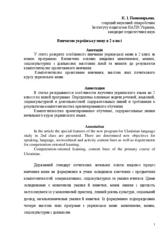 - Пономарьова, К. І. (2013) Studying Ukrainian in 2nd class Учитель початкової школи, 3. pp. 8-13.