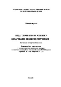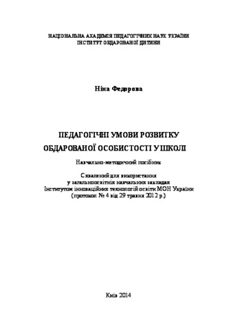 Федорова, Н.Ф. (2014) Pedagogical conditions of of gifted personality’s development at school . Інститут обдарованої дитини НАПН України, м. Київ, Україна. ISBN 978-966-2633-10-8