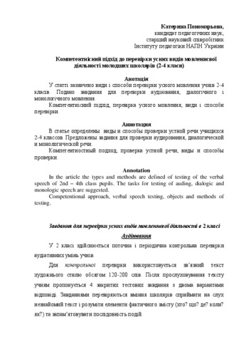- Пономарьова, К. І. (2009) Competentional approach to testing of a verbal component of speaking activity of the primary school pupils (2nd-4th classes) Початкова школа, 12. pp. 6-14. ISSN 0131-5358