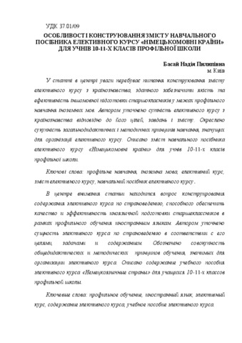 A question of content constructing of Country Studies elective course, that is aimed to provide quality and efficiency of foreign language studying of senior pupils within the limits of foreign languages Profile education, is in the article spotlight. The essence of the Country Studies elective course in accordance with its aims, tasks and content is specified by the author. Complex of general didactic and methodical educational principles, meaningful for organization of the elective course, is outlined. Content of the elective course “German-Speaking Countries” manual for 10–11 form students of Profile school are described.