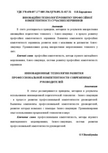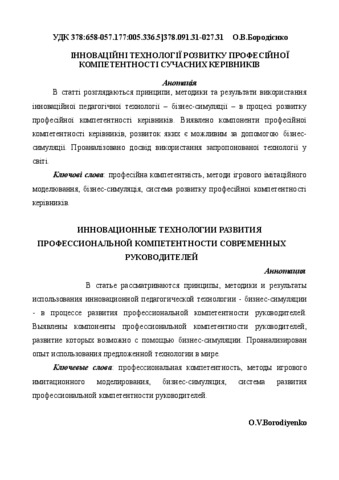 - Бородієнко, О.В. (2014) Innovative technologies of managers' professional competence development Мистецька освіта: зміст, технології, менеджмент, 9. pp. 60-75.