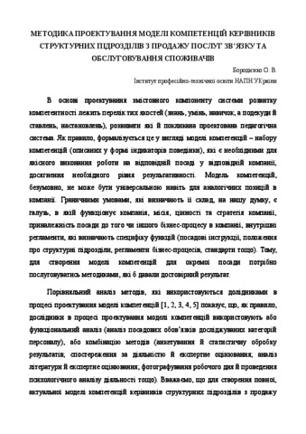 - Бородієнко, О.В. (2015) Modelling of competencies of managers of sales of communication services and customer service departments In: Науково-методичне забезпечення професійної освіти і навчання: матеріали Звітної науково-практичної конференції за 2014 рік . Інститут професійно-технічної освіти НАПН України, м.Київ, Україна, pp. 136-138.