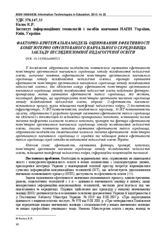 - Колос, К.Р. (2015) Criteria factor model of efficiency assessment of computer oriented learning environment of an institute of postgraduate pedagogical education Інформаційні технології в освіті, 1 (22). pp. 80-92. ISSN 1998-6939