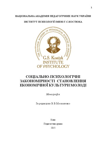This collective monograph was prepared by scientists of social psychology laboratory of the Institute of Psychology named by G.S. Kostiuk of NAPS of Ukraine. There are considered social-psychological patterns of youth’ economic culture becoming in the national educational space. The authors reveal the features and dynamics of formation of pupils’ and students’ economic culture. Special attention is paid to the relationship between "economy" and "morality" in the system of interconnected and interacting of economic and psychological factors like individual awareness of in social-economic sphere; value-emotional attitude to the social-economic area; instruction with active forms of economic activity of the individual. The features of economic culture types depending on the age of students are studied. Types of monetary culture of senior pupils, depending on the attitude to money are shown. Then it was constructed structural-functional model of youth’ economic culture becoming. It could be used in the practice of the economic education of young people. The monograph is addressed to psychologists: scientists and practitioners, academics and all other professionals working in the field of youth’ economic education.