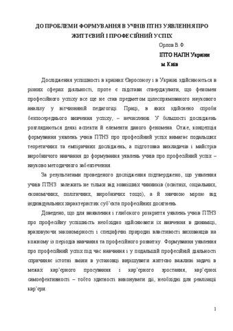 - Орлов, В.Ф. (2015) By the the problem of forming of the students of vocational education representations about life and professional success In: Науково-методичне забезпечення професійної освіти і навчання: матеріали Звітної науково-практичної конференції за 2014 рік (26 березня 2015 р.) , 2 . Інститут професійно-технічної освіти НАПН України, м.Київ, Україна, pp. 55-59.