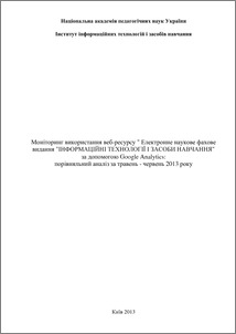 - Шиненко, М.А., Сороко, Н.В. and Ткаченко, В.А. (2013) Моніторинг використання веб-ресурсу " Електронне наукове фахове видання "Інформаційні технології і засоби навчання" за допомогою Google Analytics: порівняльний аналіз за травень - червень 2013 року [Experiment] (Unpublished)