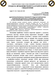 - Єжова, О. О. (2011) Health saving technology in educational system of formation of values related to health among students of vocational educational establishments Педагогічні науки: теорія, історія, інноваційні технології (3). pp. 65-74. ISSN 2312-5993