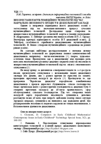 - Горленко, В.М. (2013) The use of multimedia technology in the educational process in preschools In: Науково-практична конференція "Мультимедійні технології в освіті та інших сферах діяльності": Тези доповідей . Національний авіаційний університет, м.Київ, Україна, p. 26.