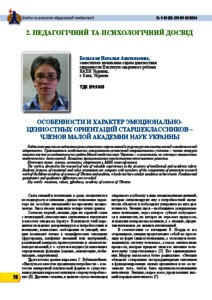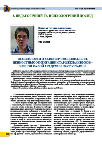 - Бельська, Н.А. (2014) Peculiarities and character of emotional and estimative orientations of high-school pupils – members of Minor Academy of Science of Ukraine Освіта та розвиток обдарованої особистості, 9-10 (28-29). pp. 58-63. ISSN 2309 ‑3935