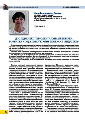 - Прашко, Олена Володимирівна (2014) Investigational and experimental verification of development of the social competence of teenagers Освіта та розвиток обдарованої особистості, 9-10 (28-29). pp. 82-86. ISSN 2309 ‑3935