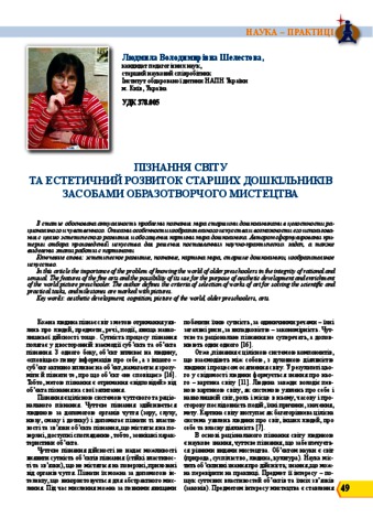 - Шелестова, Л.В. (orcid.org/0000-0002-6057-807X) (2014) Learning of the world and esthetic development of high school pupils by means of art Освіта та розвиток обдарованої особистості, 9-10 (28-29). pp. 49-53. ISSN 2309 ‑3935