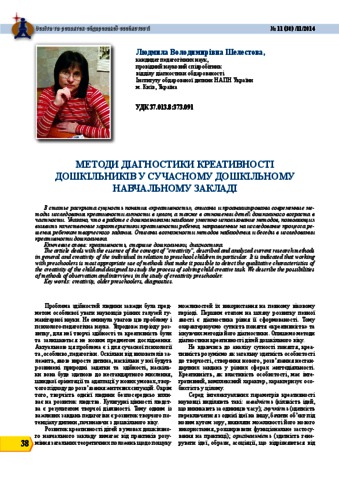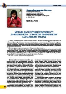 - Шелестова, Л.В. (orcid.org/0000-0002-6057-807X) (2014) Methods of diagnostics of creativeness of pre-school age children at modern pre-school educational institution Освіта та розвиток обдарованої особистості, 11 (30). pp. 38-43. ISSN 2309‑3935