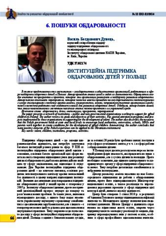 - Дунець, Василь Богданович (2014) Institutional support of gifted children in Poland Освіта та розвиток обдарованої особистості, 12 (31). pp. 66-69. ISSN 2309 ‑3935