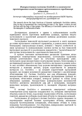 - Гриб'юк, О.О. and Юнчик, В.Л. (2015) Using GeoGebra in the context of computer-based learning environment In: П'ята науково-практична конференція FOSS Lviv 2015 (23-26 квітня 2015 року) Матеріали п'ятої науково-практичної конференції FOSS Lviv 2015 . Львівський національний університет імені Івана Франка, м.Львів, Украъна, pp. 15-17. ISBN 978-966-2598-49-0