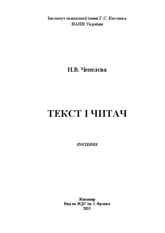 Чепелєва, Н.В. (2015) The text and the reader . ЖДУ ім. І. Франка, м.Житомир, Україна. ISBN 978-966-485-191-3