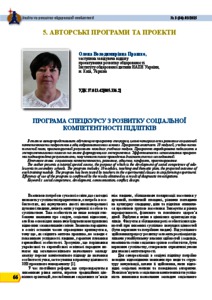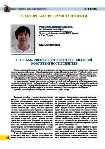 - Прашко, Олена Володимирівна (2015) Special course program for development of social competence of adolescents Освіта та розвиток обдарованої особистості, 3 (34). pp. 66-76. ISSN 2309‑3935