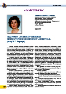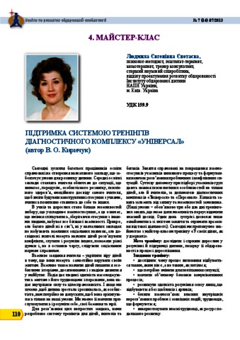 - Єнотаєва, Л. Є. (2013) Support training system of diagnostic complex "Universal" (by V. Kirichuk) Освіта та розвиток обдарованої особистості, 7 (14). pp. 110-113. ISSN 2309-3935