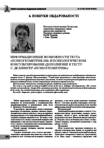 - Бєльська, Н.А. (orcid.org/0000-0003-0697-3973) (2013) Information capabilities of the test «Psihogeometriya-2M» in psychological counseling (supplement to the test S. Dellinger «Psihogeometriya») Education and Development of Gifted personality, 8-9 (15-16). pp. 200-205. ISSN 2309-3935
