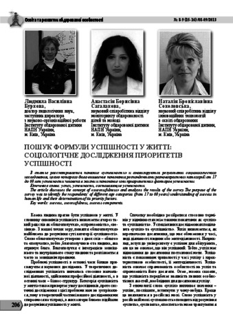 - Буркова, Людмира Василівна, Сагалакова, Анастасія Борисівна and Соколовська, Наталія Броніславівна (orcid.org/0000-0003-3799-4005) (2013) Finding the formula of success in life: sociological research of success priorities Education and Development of Gifted personality, 8-9 (15-16). pp. 206-212. ISSN 2309-3935