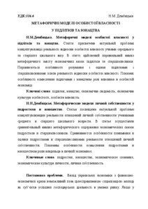 - Дембицька, Н.М. (2015) Мetaphorical models of personal property in economic consciousness of teenagers and young adults Актуальні проблеми психології: збірник наукових праць Інституту психології імені Г.С.Костюка НАПН України, 11. pp. 61-70. ISSN 2072-4772